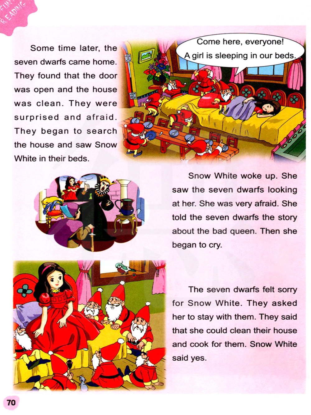 一段时间过后,七个小矮人回来,他们发现房门开了,房子干净了。他们感到又惊又怕,他们开始搜寻房间,然后看见白雪公主在他们的床上