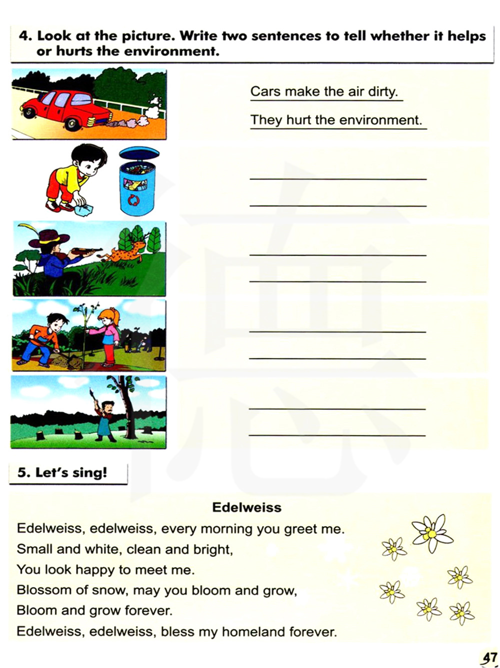 看看图片,写两个句子说明它是有利于环境还是有害于环境