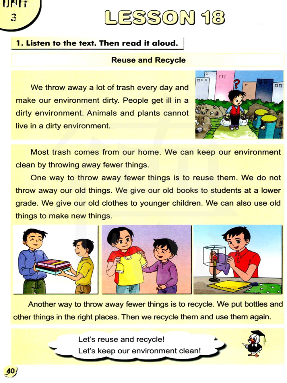 减少扔掉东西的一个方法就是再利用它们。我们不扔掉我们的旧东西。我们把旧书给低年级的学生。我们把旧衣物送给更小的孩子,我们也用旧的东西去做新的东西