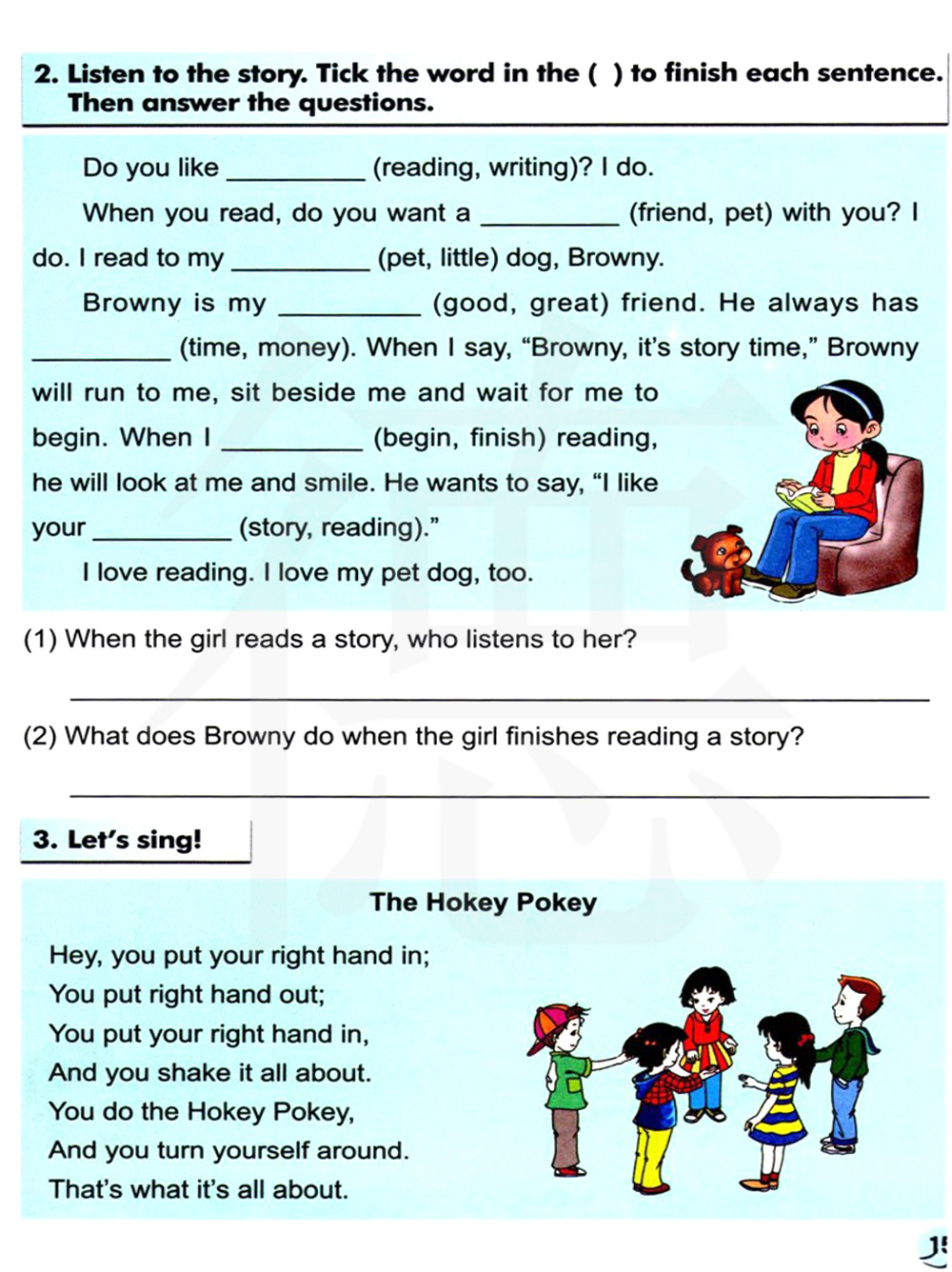 听故事的录音,勾出括号里的单词完成每个句子。然后回答问题。