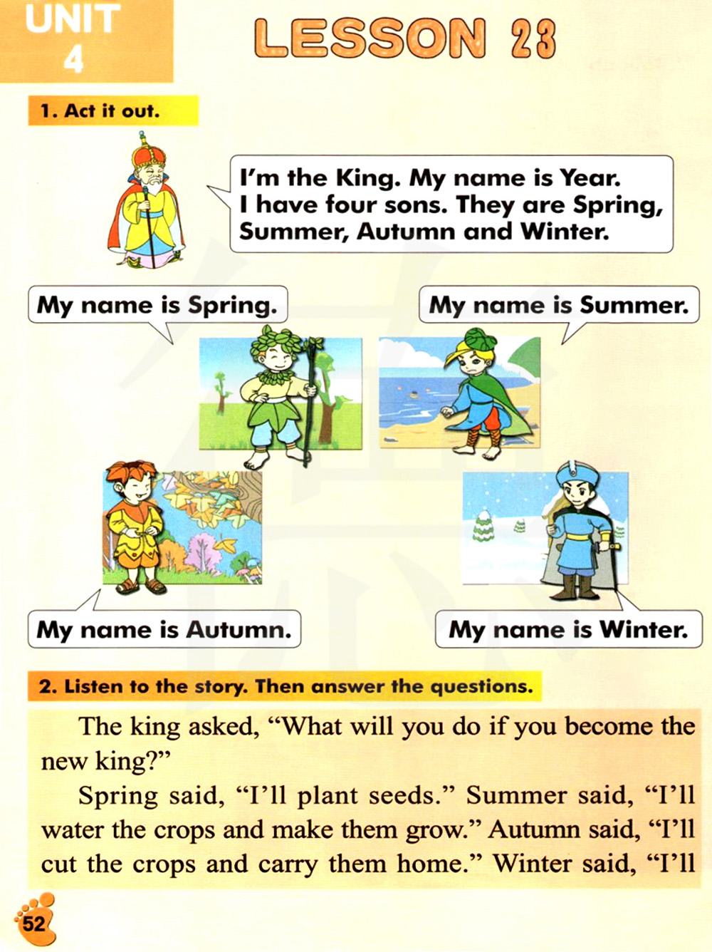 我是国王。我的名字是耶尔。我有四个儿子。他们是斯普林,萨莫,奥特姆和温特。