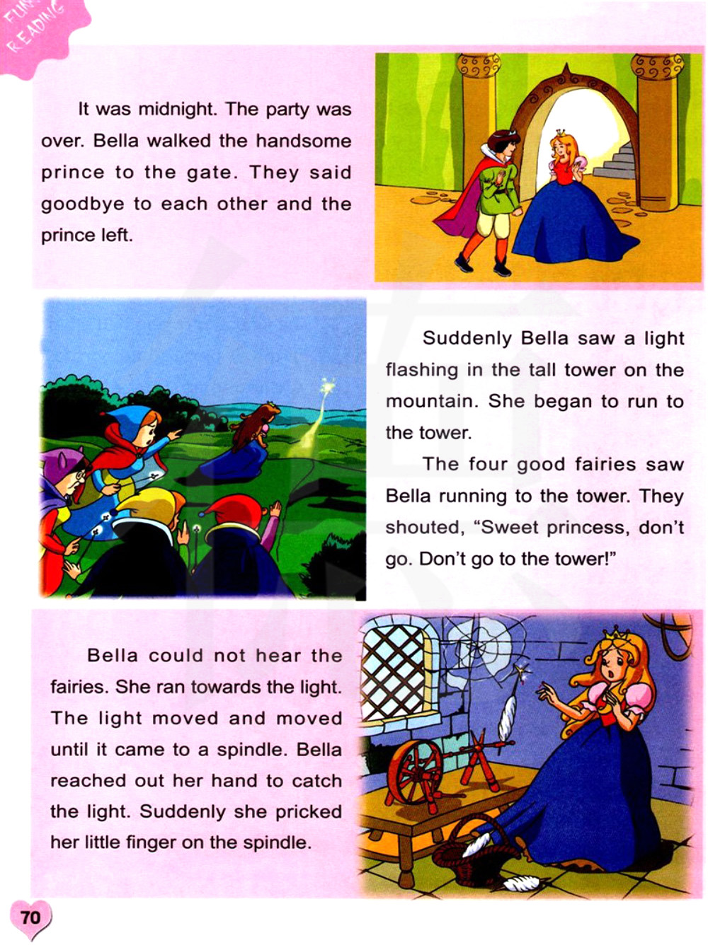 四位善良的精灵看见贝拉正跑向塔。她们呼喊:“甜美的公主,不要去。不要去那座塔!”