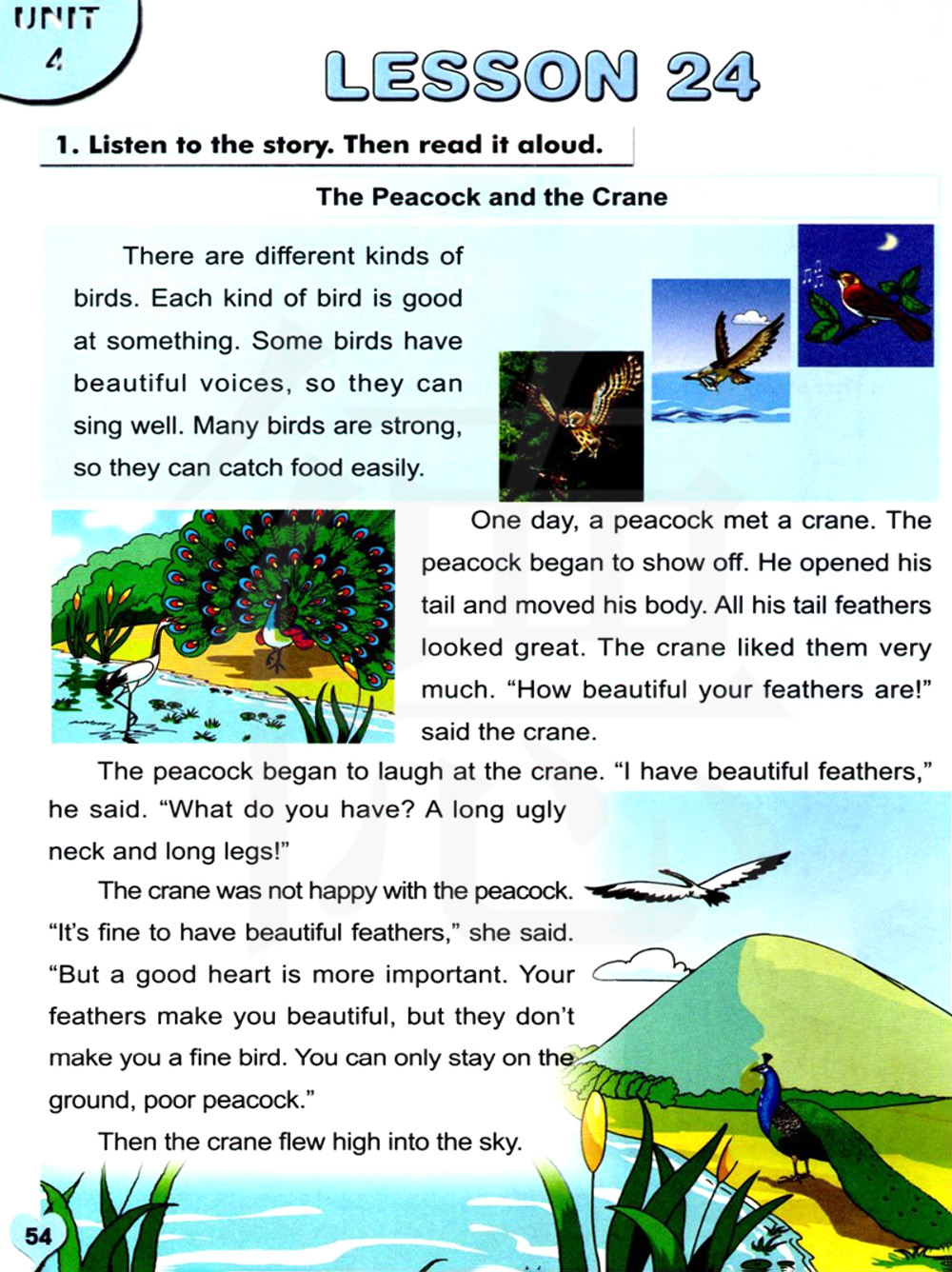 鹤对孔雀感到不满意。她说:“有美丽的羽毛是好的。”“但有一颗善良的心更重要。你的羽毛很漂亮,但是他们没能使你成为一只好鸟。你只能留在地面,可怜的孔雀。”