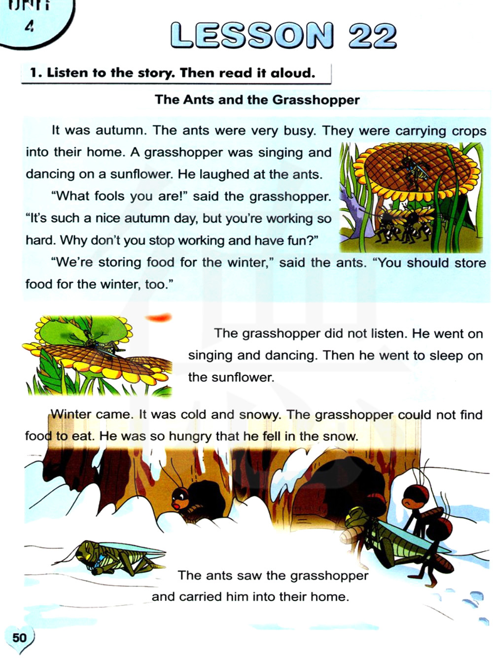 这是个秋天。蚂蚁非常忙碌。他们正抬着作物进入他们的家。一只蚂蚱正在一朵向日葵上面载歌载舞。他嘲笑蚂蚁。
