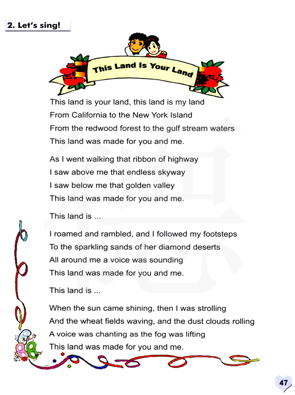这片土地是你的土地,这片土地是我的土地 从加利福尼亚到纽约岛 从红杉林到墨西哥湾流 这片土地是为你和我而建立。当我漫步在蜿蜒如带的公路 仰头看见高架公路伸向无边的天际 在我下方是金色的溪谷 这片土地是为你和我而建立。这片土地是你的土地,这片土地是我的土地 从加利福尼亚到纽约岛 从红杉林到墨西哥湾流 这片土地是为你和我而建立。我漫游四方,任脚把我带进她的沙漠闪光的沙丘 我的四周回响着一个声音,这片土