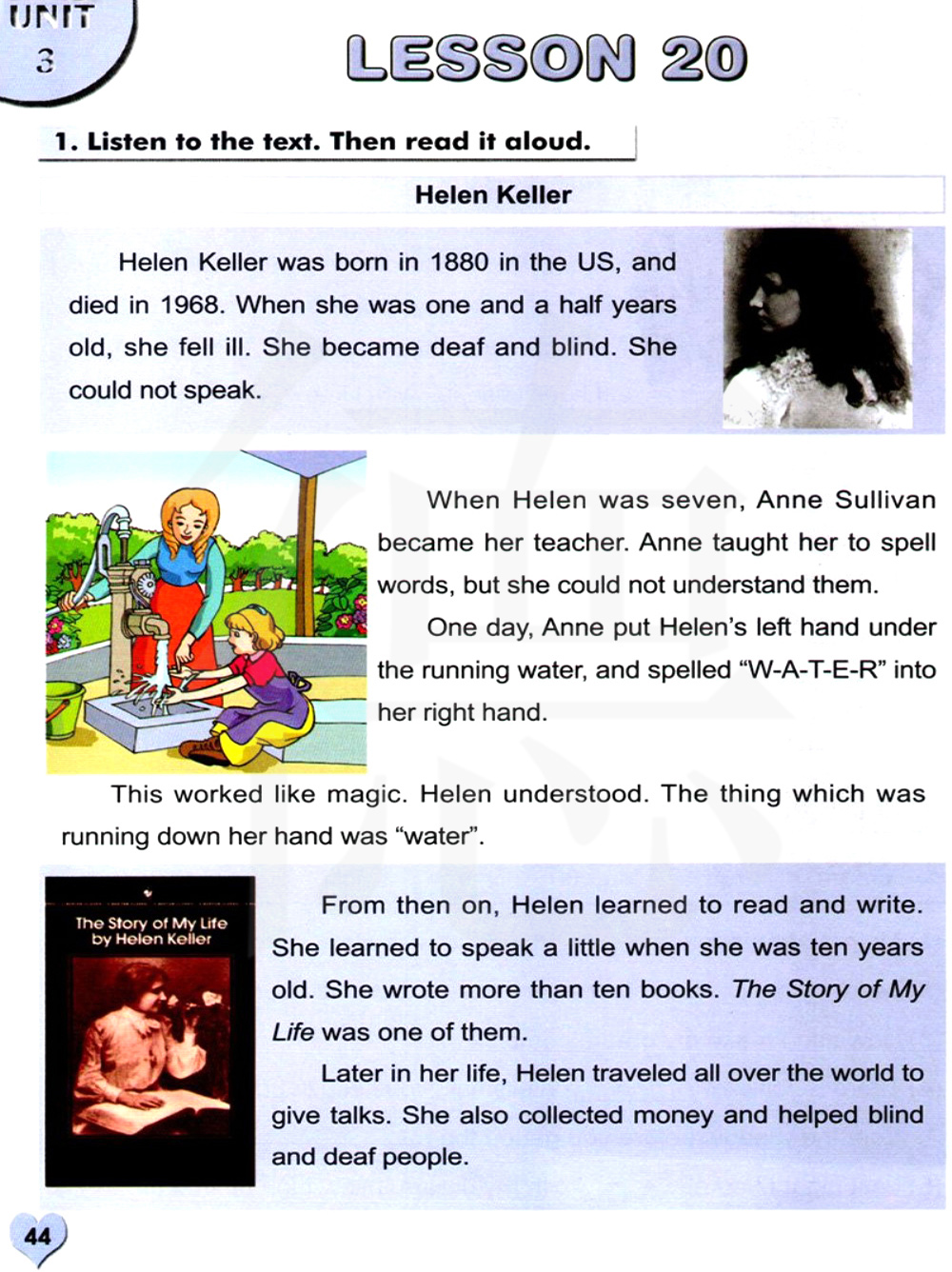 1880年,海伦.凯勒出生在美国。于1968年,她逝世。当她一岁半的时候,她生病了。她变得又聋又盲。她不能说话。