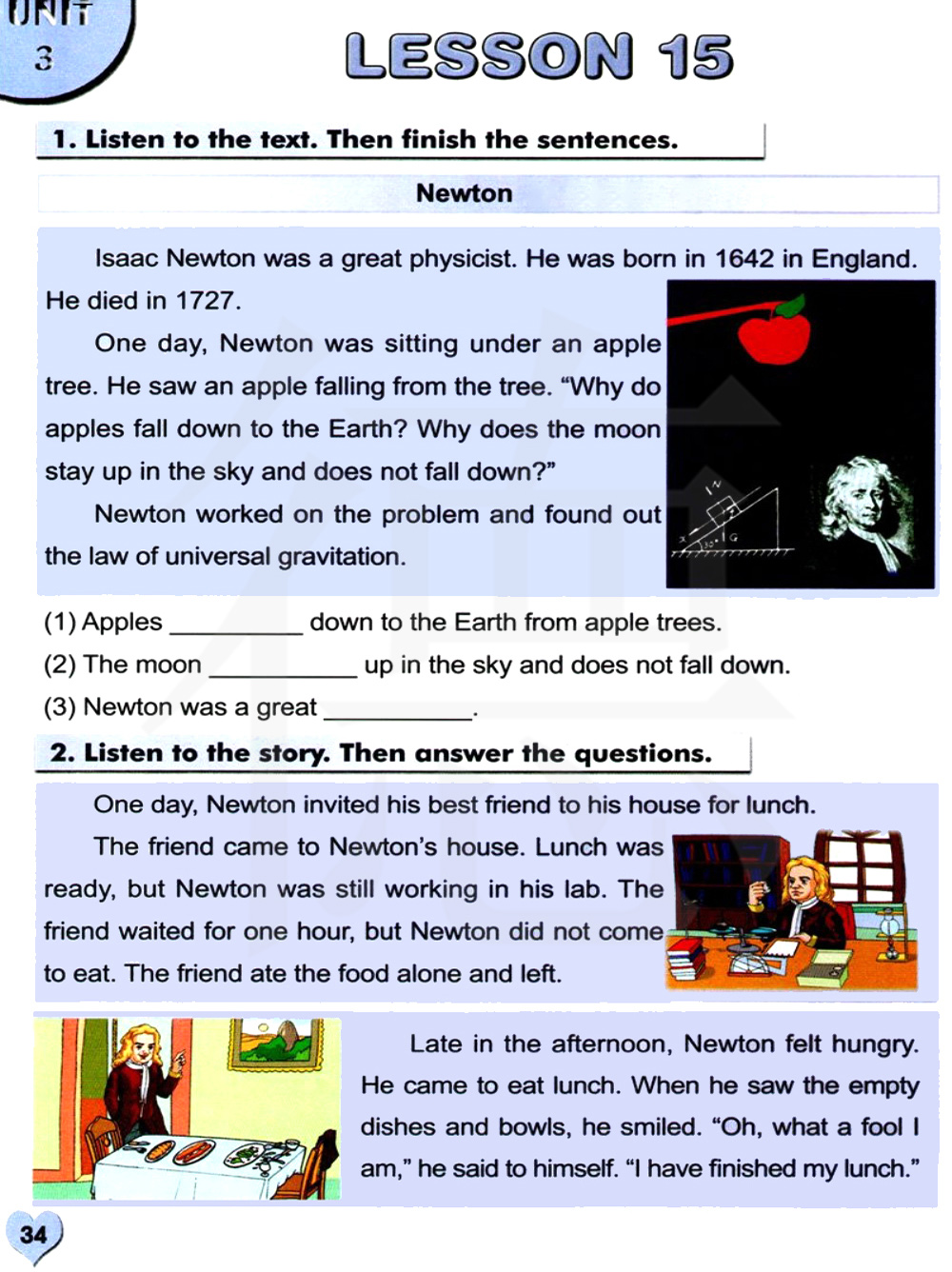 下午很晚时,牛顿搞到饿了。他去吃午饭。当他看见空空的盘子和碗时,他笑了。他对自己说:“噢,我真是一个傻瓜。”“我已经吃完我的午餐了。”