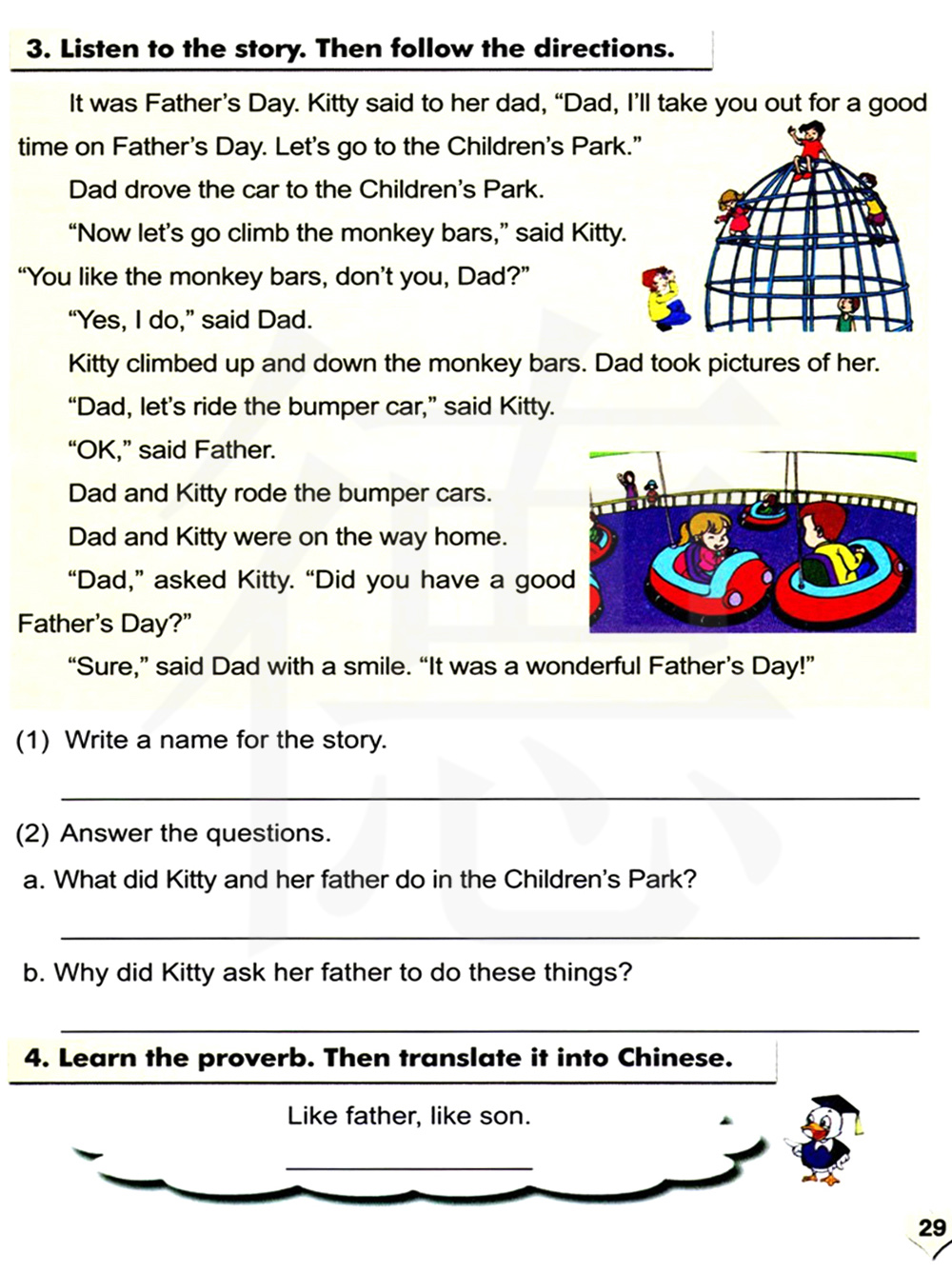 基蒂问:“爸爸,”“你有一个开心的父亲节吗?”爸爸笑着说:“当然有,”“这是一个美妙的父亲节!”