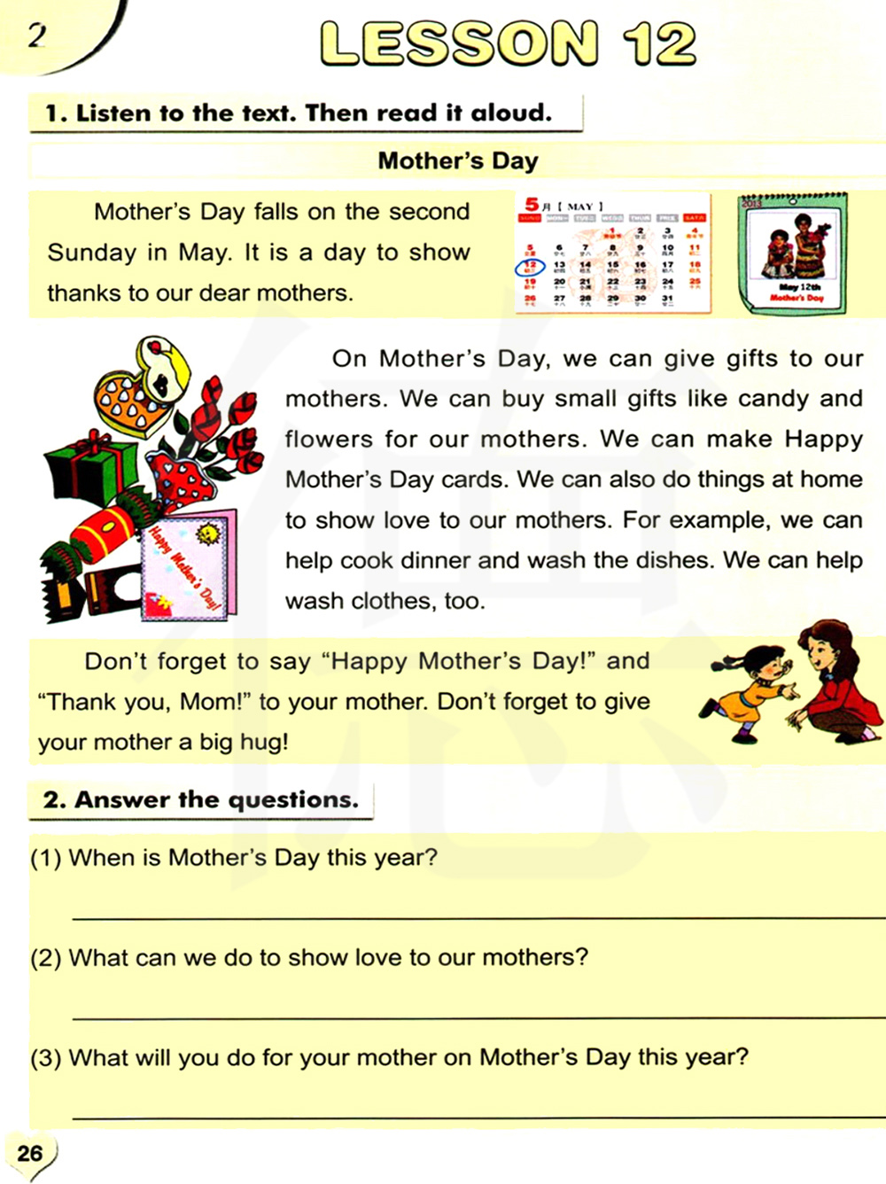 在母亲节,我们可以给我们的母亲送礼物。我们可以为我们的母亲买一些小礼物,如糖果和花朵。我们可以制作母亲节贺卡。我们页可以在家里做一些事情表达我们对母亲的爱。例如,我们可以帮忙做饭和洗碗。我们也可以帮忙洗衣服。