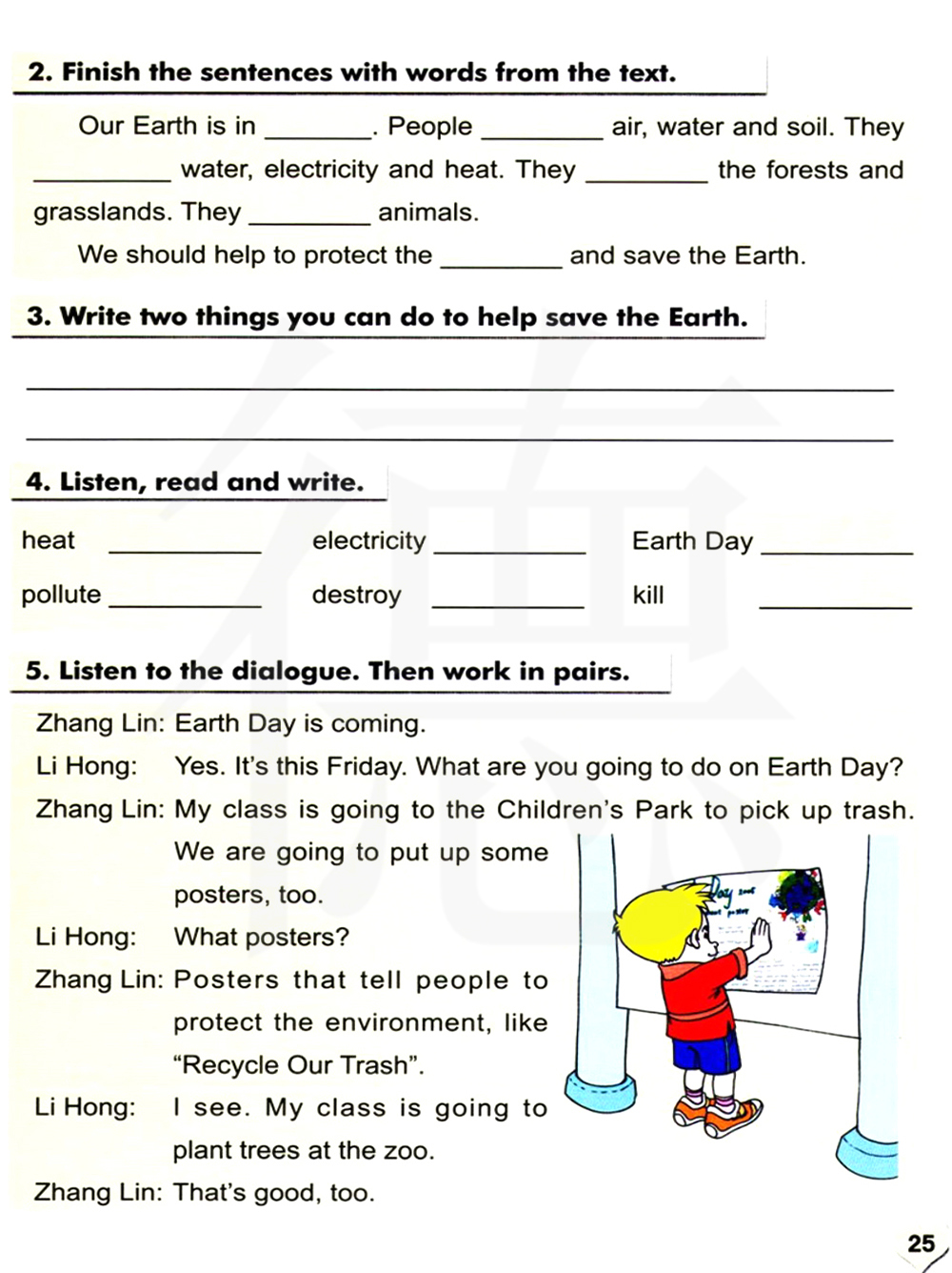 是那些呼吁人们保护环境,像“循环利用我们的垃圾”的海报。我明白了。我们的班级打算在动物园里植树。那也很好。