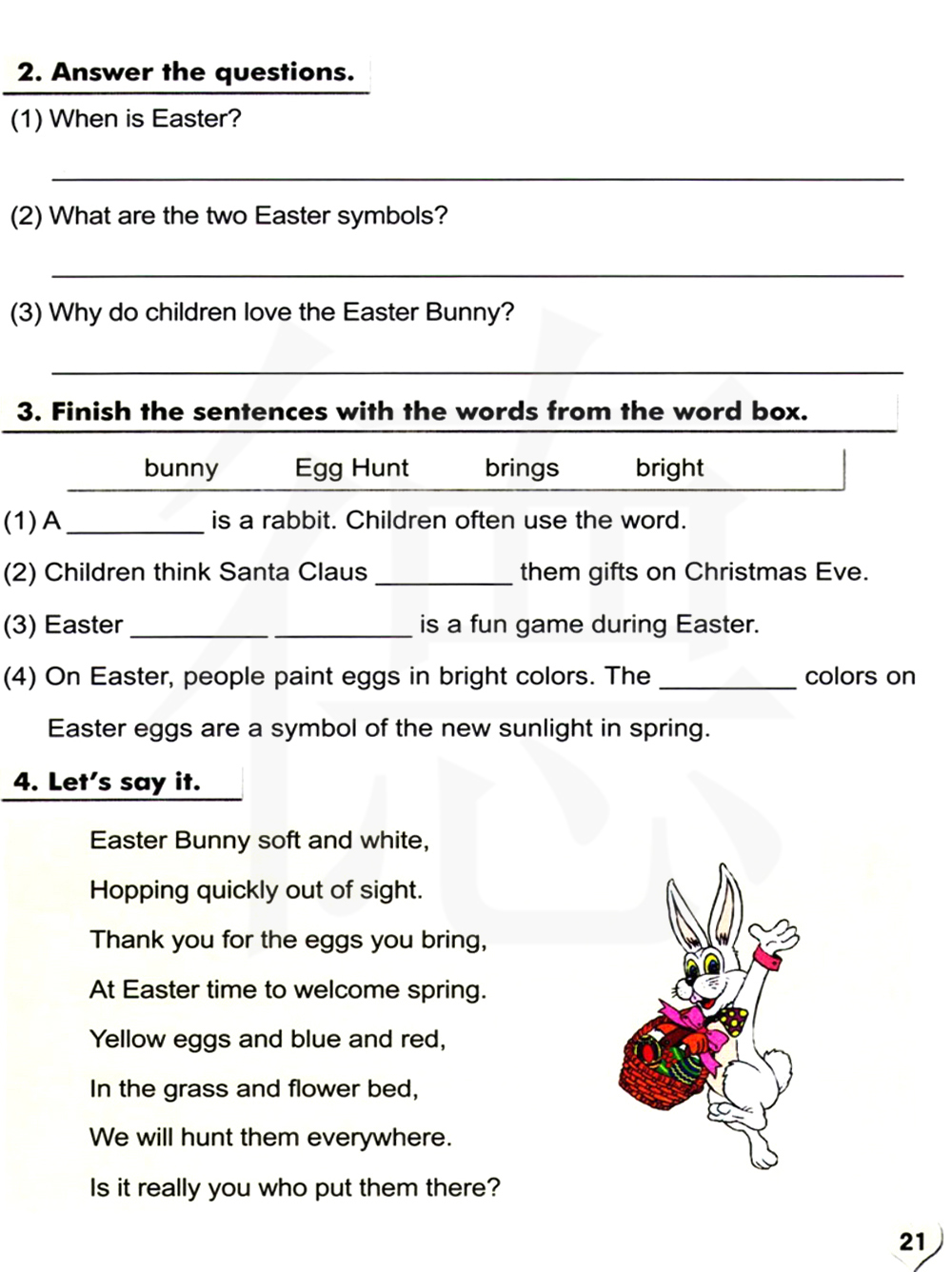 复活节兔子柔软又洁白,蹦蹦跳跳迅速地消失在实现之中。谢谢你带来的彩蛋,复活节的时间欢迎春天的到来,黄色的蛋,还有蓝色和红色,藏在草地和花坛里,我们将到处寻找它们。真的是你把它们放在那 里的吗?