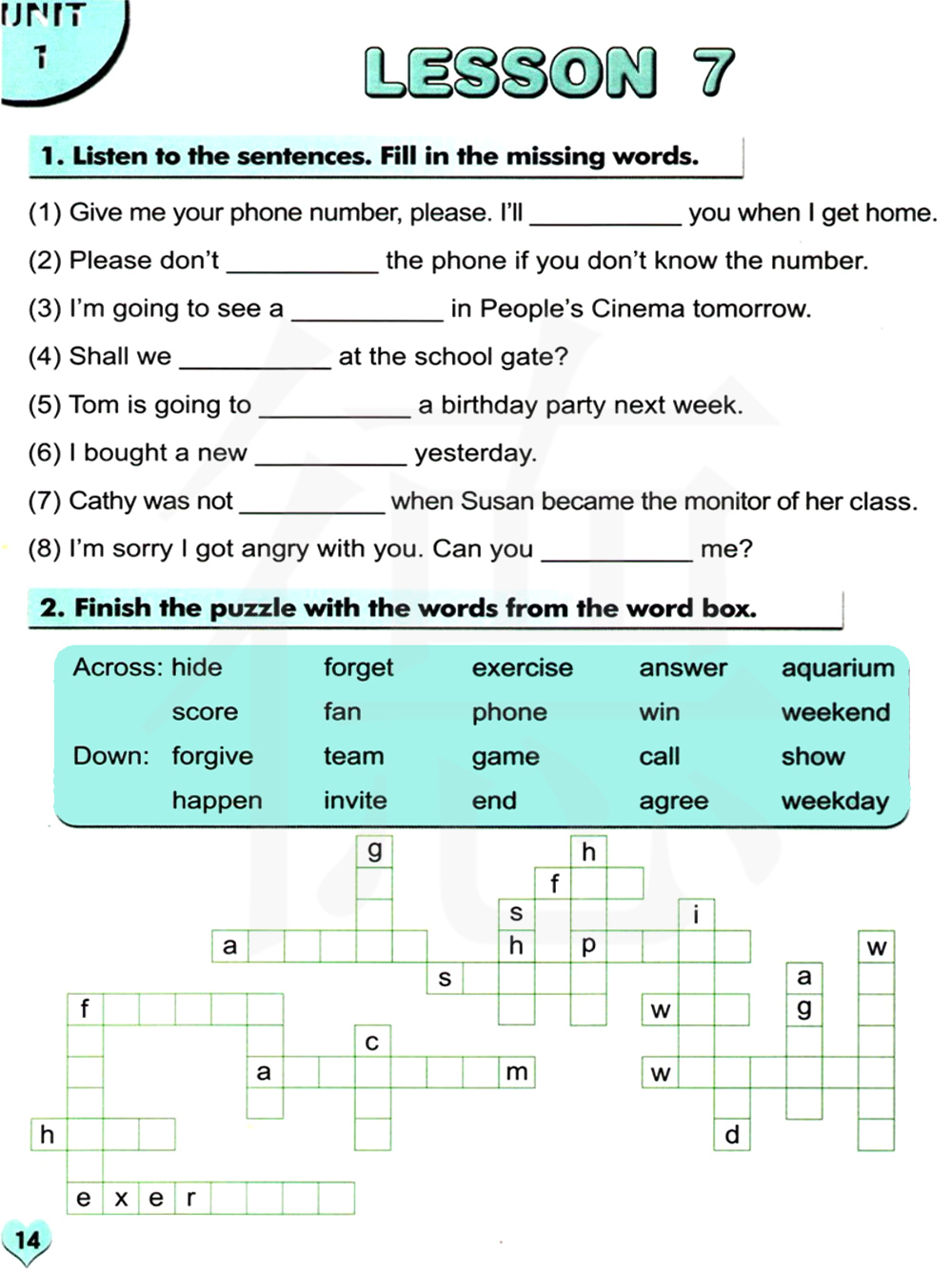 横向:把...藏起来、忘记、运动;练习、回答、水族馆,鱼缸、比分,分数、迷,风扇、电话、赢,胜利、周末