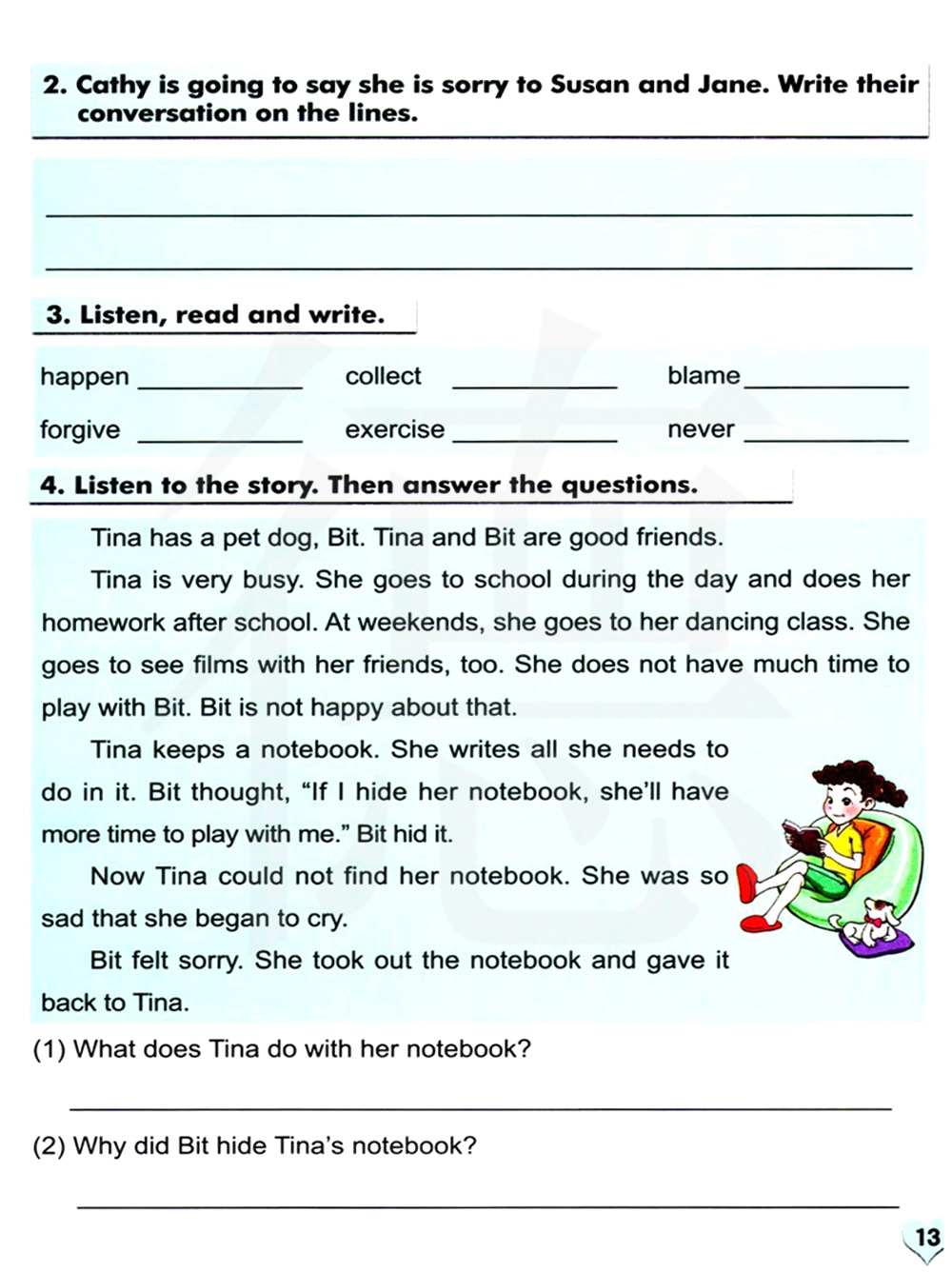 蒂娜有一本笔记本。她把她需要做的事情都写在里面。比特想:“如果我把她的笔记本藏起来,她将会有更多的时间陪我玩。”比特把它藏了起来。