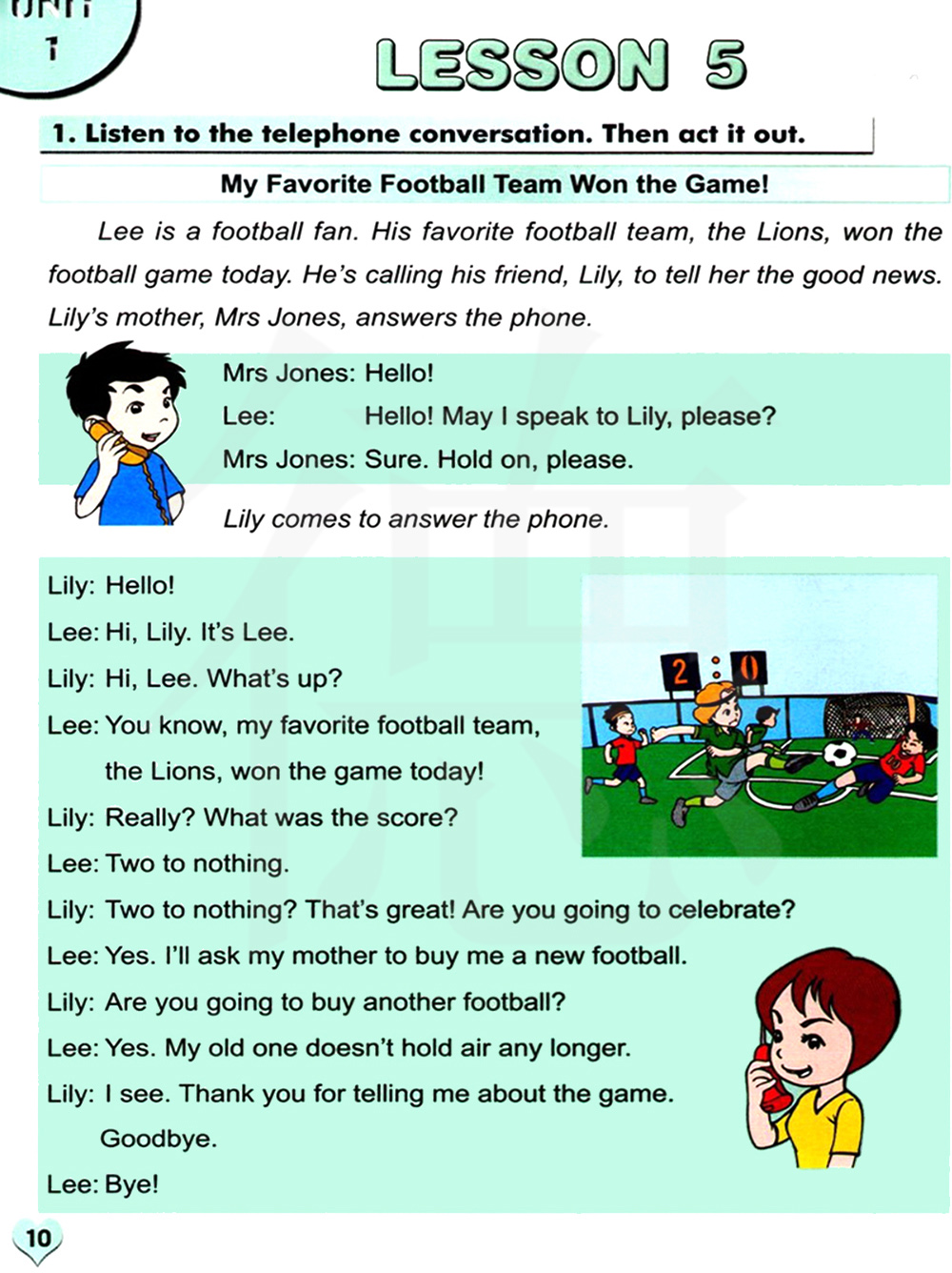 李是个足球迷。他最喜欢的足球队,狮子队,今天赢得了足球比赛。他正在打电话给他的朋友莉莉,告诉她这则好消息。莉莉的妈妈琼斯接了电话。