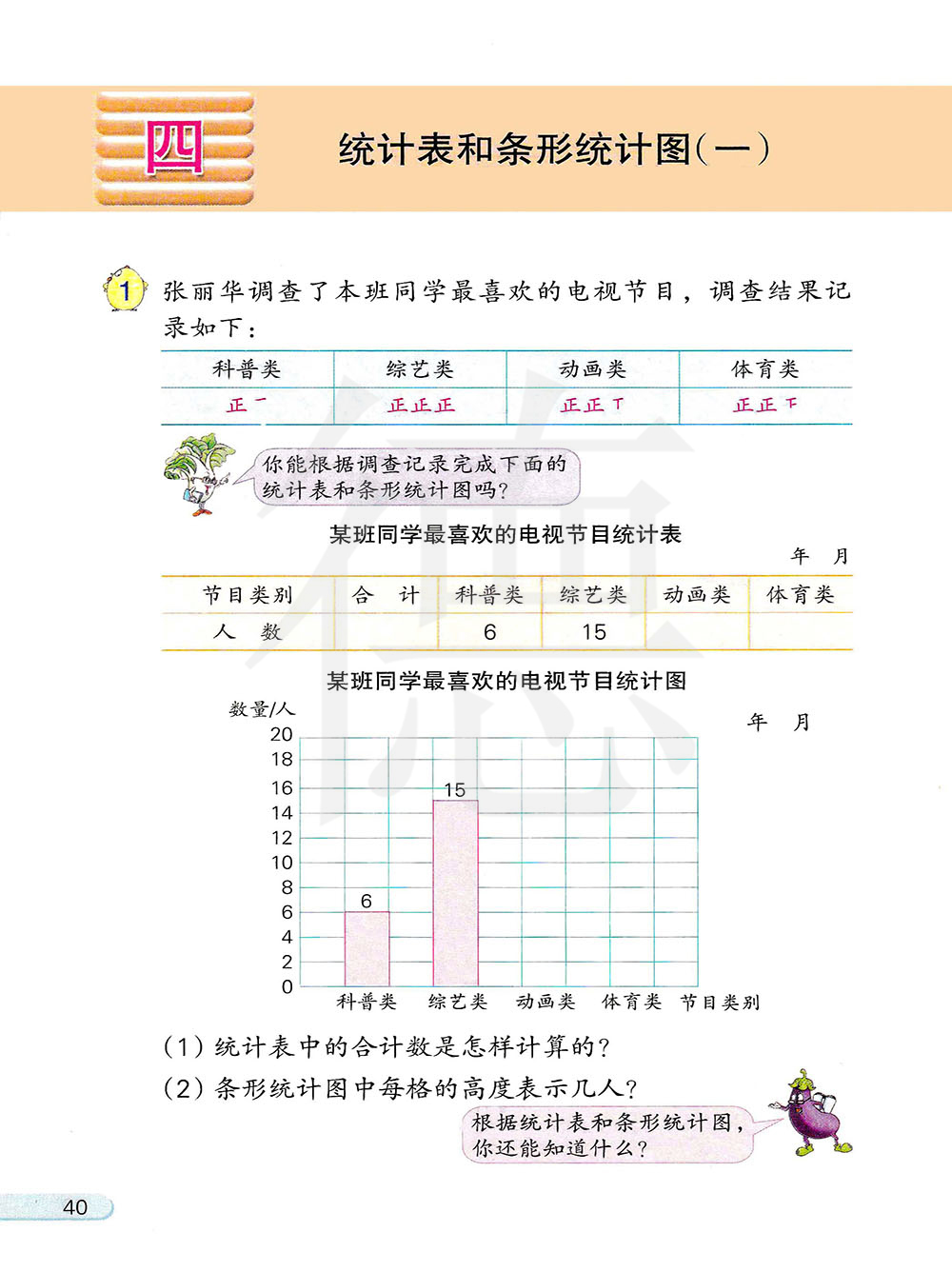 1、统计表用表格呈现数据,条形统计图用直条呈现数据。 2、统计表中“合计”是几个项目数量的总计。 3、通常用画“正”字的方法来整理数据。 4、求平均数的方法:?、移多补少; ?、先求和再求平均数 ( 平均数=总数量÷总个数)