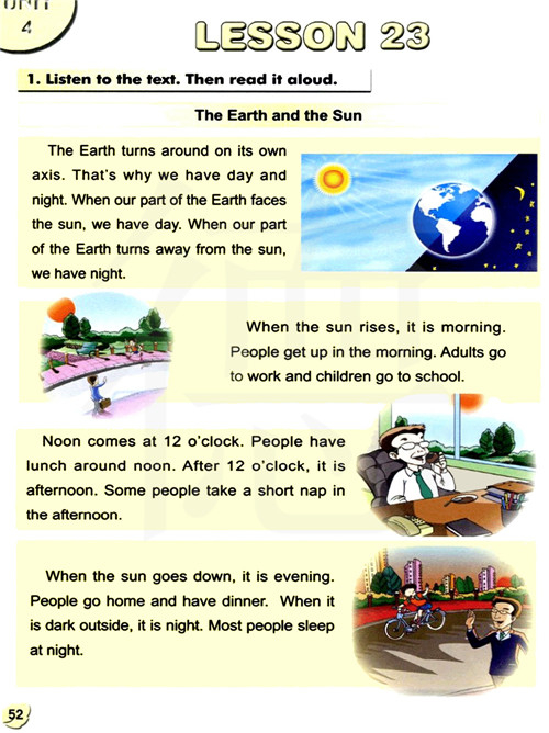 当太阳升起的时候,那是早晨。人们在早晨起床,大人去上班,小孩去上学。中午在12点来临。人们在中午吃午餐,在12点以后,那是下午。一些人们在下午睡午觉。