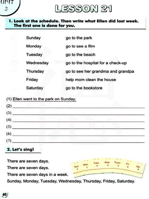 看下面的日程表。然后写出艾伦上个星期做了什么。第一个已经为你做好了。