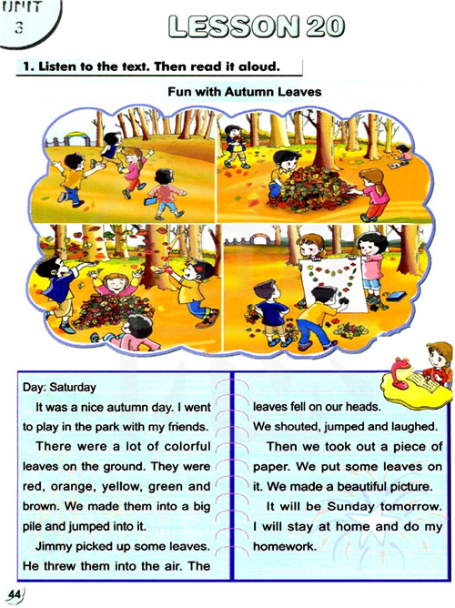树叶落到我们的头上。我们叫着,跳着并且笑着。然后我们拿出一张纸。我们把一些叶子放在上面。我们做成一副漂亮的图案。明天是星期天。我将呆在家里做功课。
