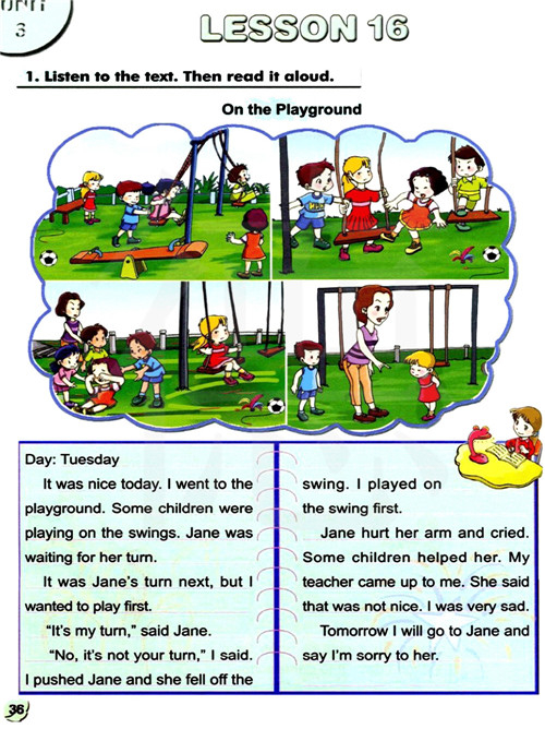日子:星期二今天的天气很好。我去运动场了,一些小朋友在玩秋千。简在等着玩。下一轮到简了,但是我想先玩。“轮到我来,”简说。“不,不是轮到你了。”我说。我推开简,她从秋千上摔下来了。