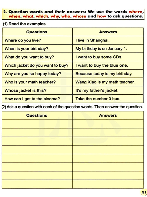 疑问句和它们的回答:我们使用where,when,what,which,why,who,whose和how来问问题。