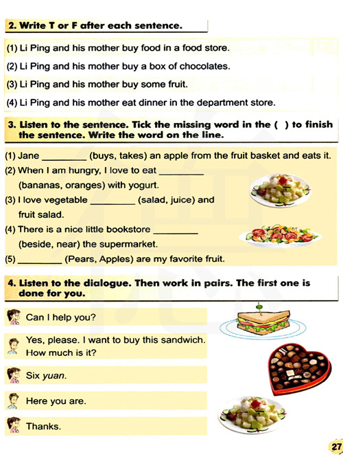 听句子。在括号里勾出缺失的单词来完成句子。把单词写在横线上。