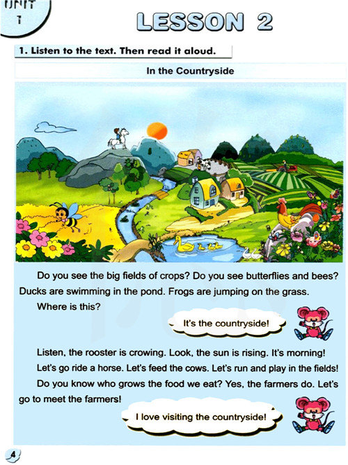 你看到大片的田野吗?你看到蝴蝶和蜜蜂吗?鸭子在池塘游泳,青蛙在草丛中跳跃。