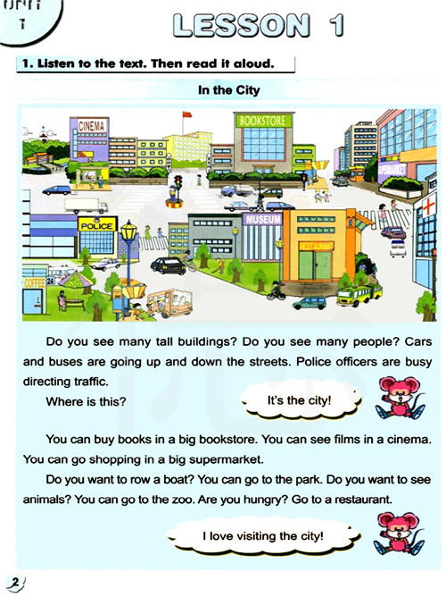 你看到许多高大的建筑物吗?你看到许多人吗?小汽车和公共汽车在街道上穿梭,警察正在忙着指挥交通。