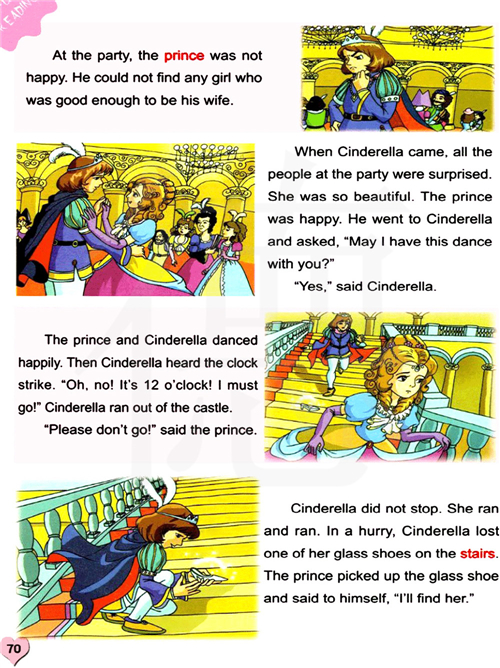 王子和灰姑娘高兴的跳舞。然后,灰姑娘听到钟敲响了。噢,不,十二点了,我必须走了。灰姑娘跑出了城堡