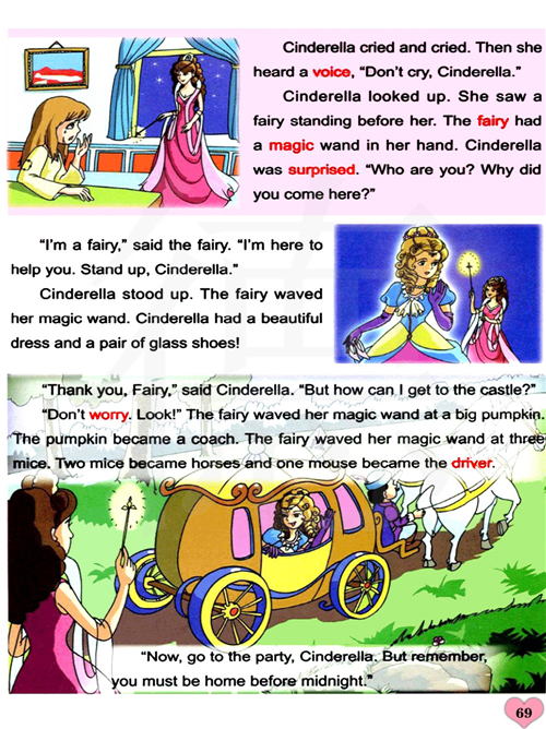 谢谢,仙子,可是,我要怎么去城堡? 不要担心,看。仙子把她的魔棒挥向一只南瓜,南瓜变成了一辆四轮马车。仙子把魔棒挥向四只老鼠,两只老鼠变成了马,一只老鼠变成了车夫