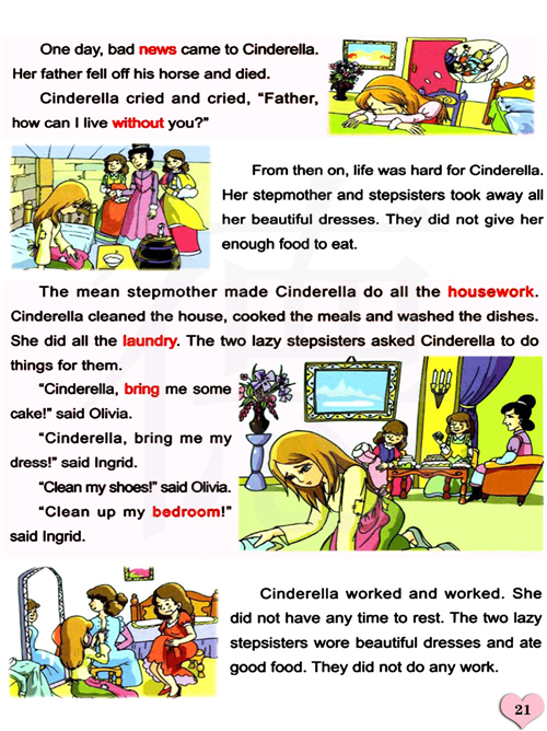 刻薄的继母让灰姑娘做完所有的家务,灰姑娘打扫房间,做饭,洗碗,她洗完所有需要洗的脏衣服。两个懒惰的继姐妹叫灰姑娘为她们做事情。
