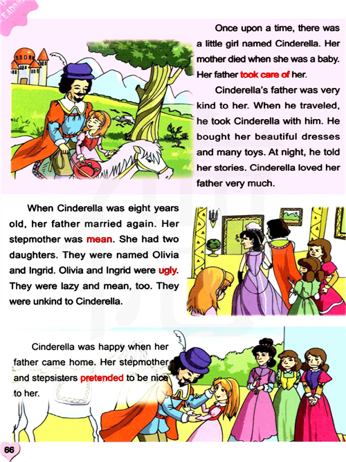灰姑娘八岁的时候,她的父亲再婚了。她的继母很刻薄。她有两个女儿,她们的名字叫奥利威亚和英格力的,她们长得很丑,她们很懒惰也很刻薄,她们对回姑娘很不友好