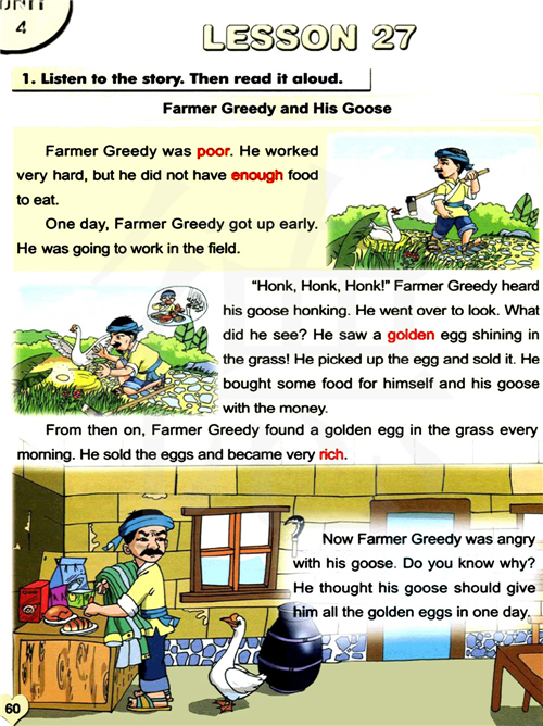 鹅,鹅,鹅。贪婪农夫听到鹅的叫声,他走过去看。他看到了什么?他看到草堆里一只金蛋在闪光。他捡起金蛋,然后卖了他。他用这些金钱买了些吃的和他的鹅