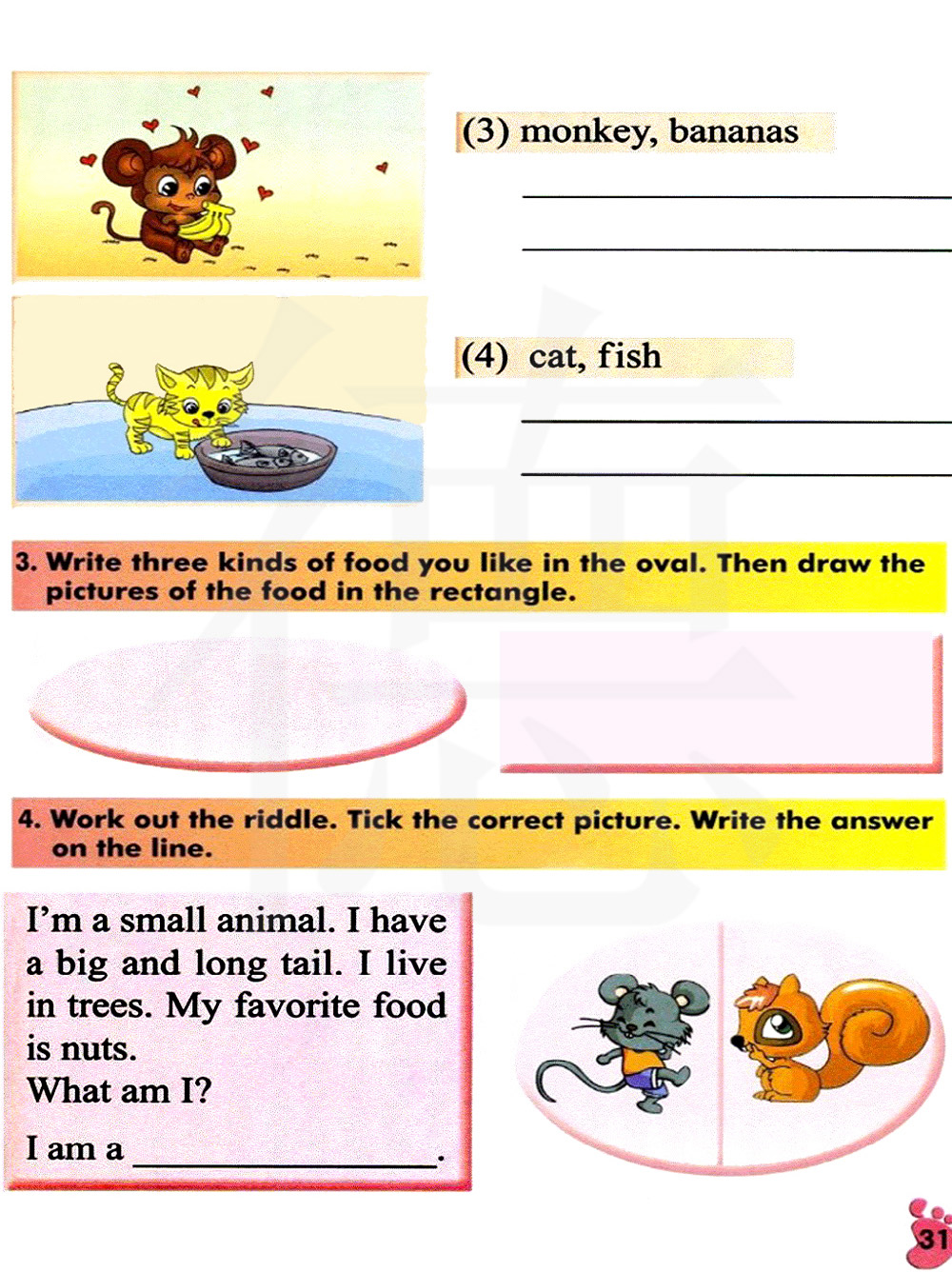 在椭圆内写出三种你喜欢的食物。然后在长方形里面画出食物。