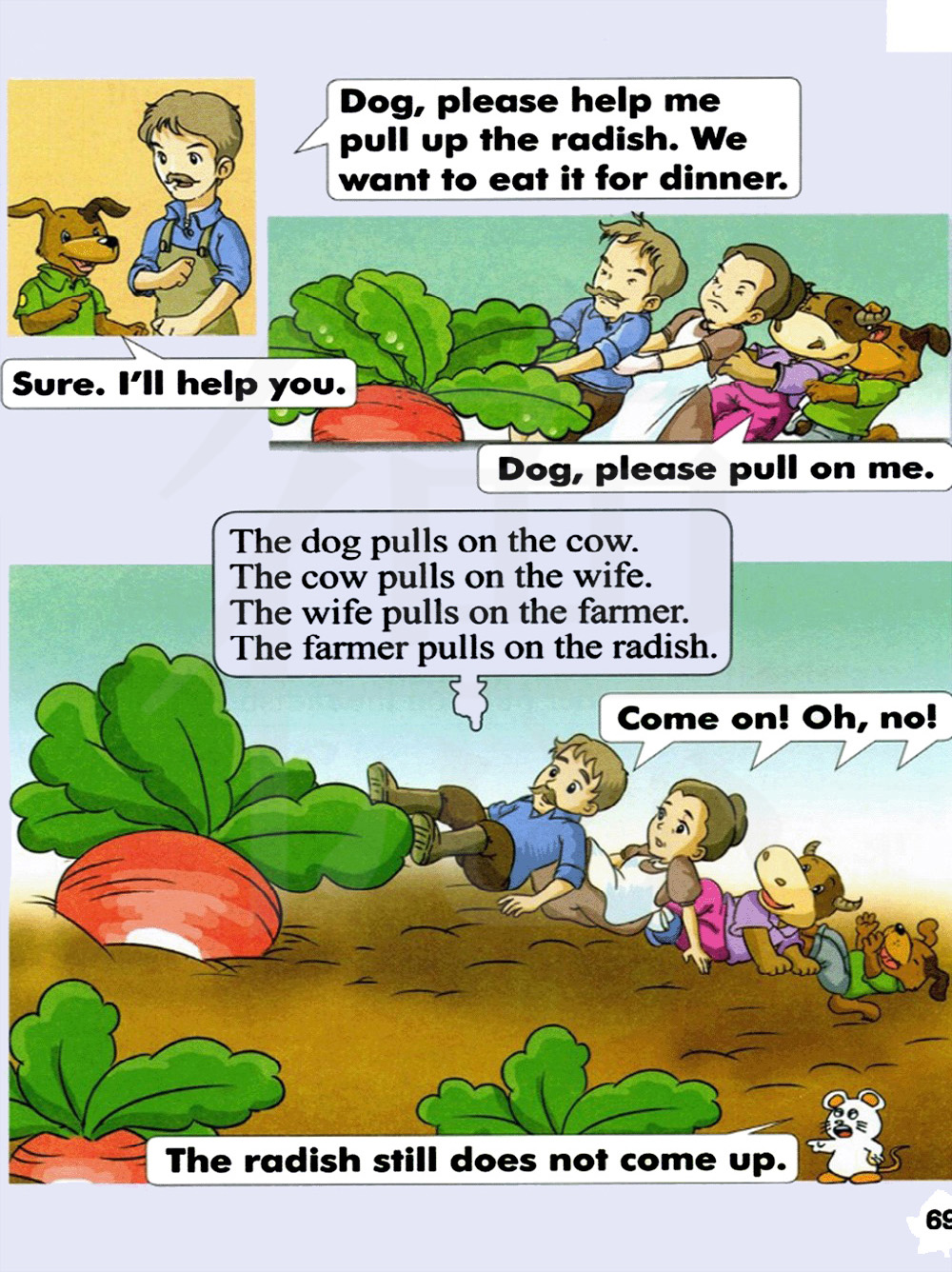 狗抓着奶牛。奶牛抓着妻子。妻子抓着农夫。农夫抓着水萝卜。