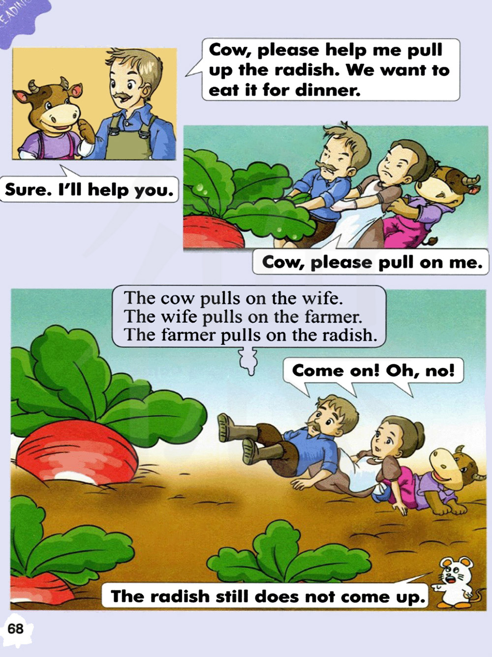 奶牛抓着妻子。妻子抓着农夫。农夫抓着水萝卜。