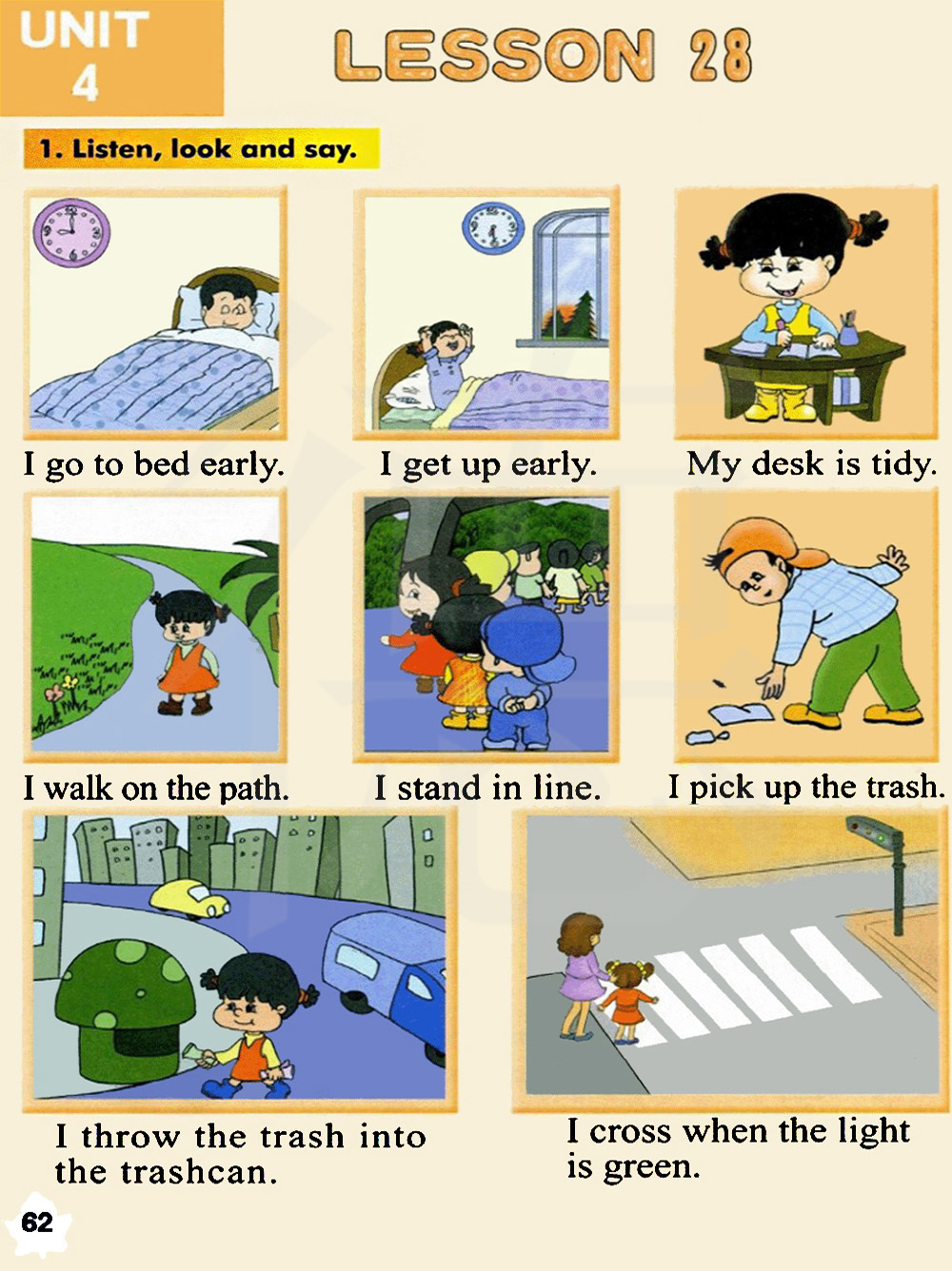 我把垃圾扔进垃圾箱里。当绿灯亮时我才过马路。