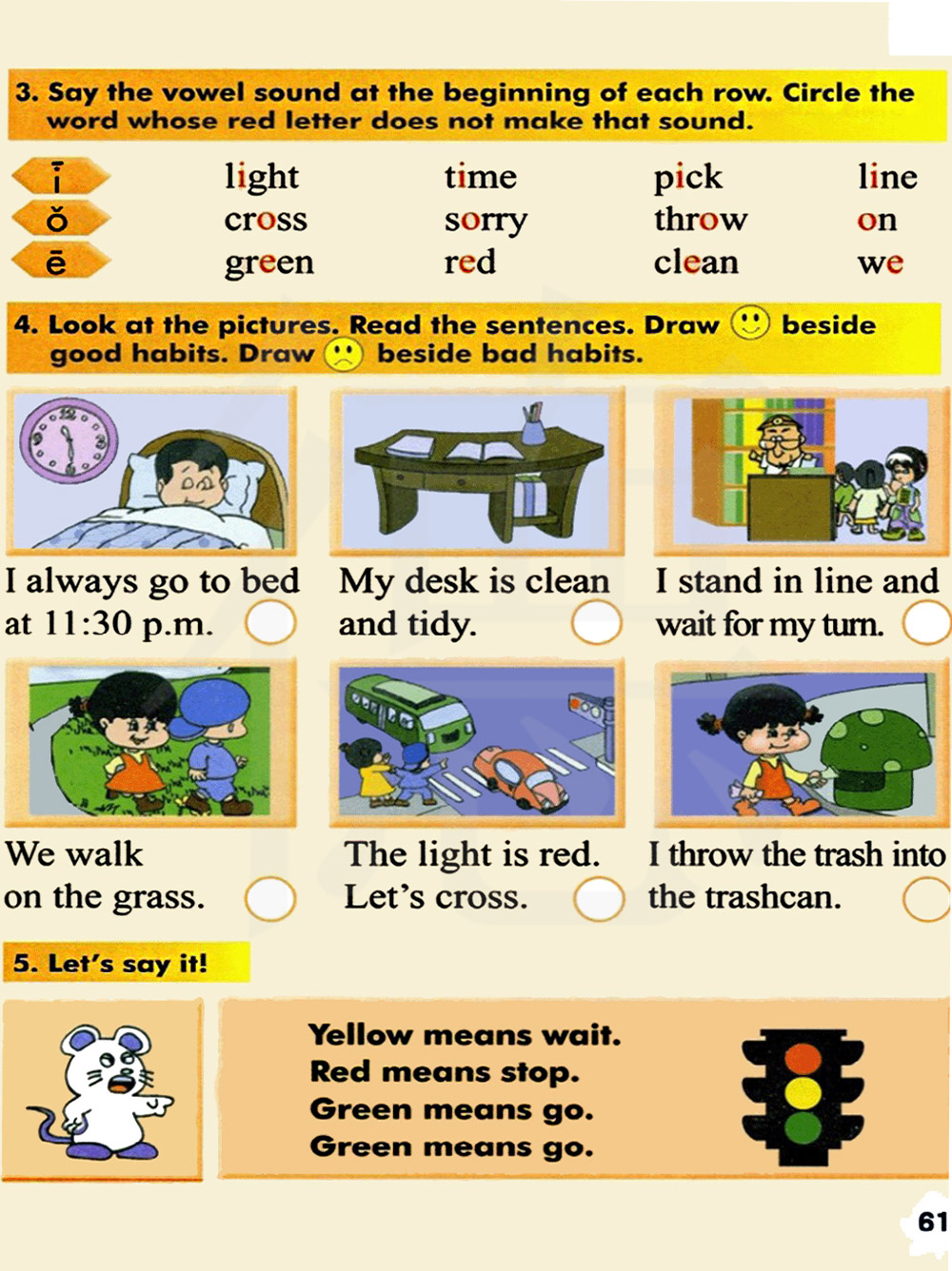 我总是晚上十一点版上床睡觉。我的书桌又干净又整洁。我排队等着轮到我自己。我们在草地上行走。现在是红灯。我们过马路吧。我把垃圾扔进垃圾箱里。