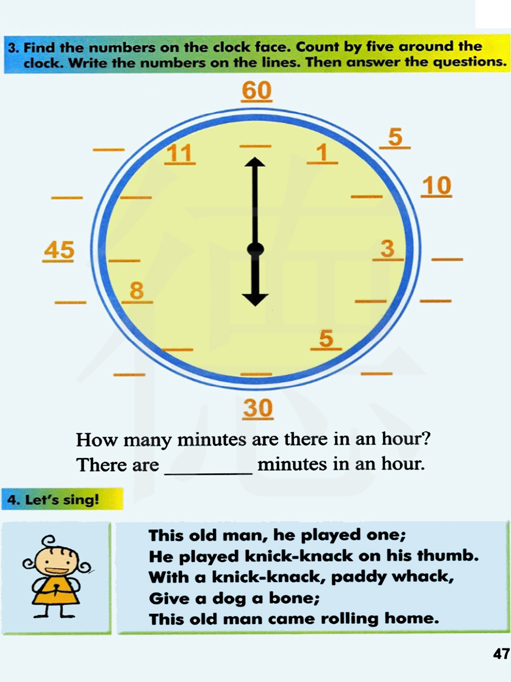 找出钟面上的数字。在时钟周围以五进制数数。把数字写在横线上。然后回答问题。