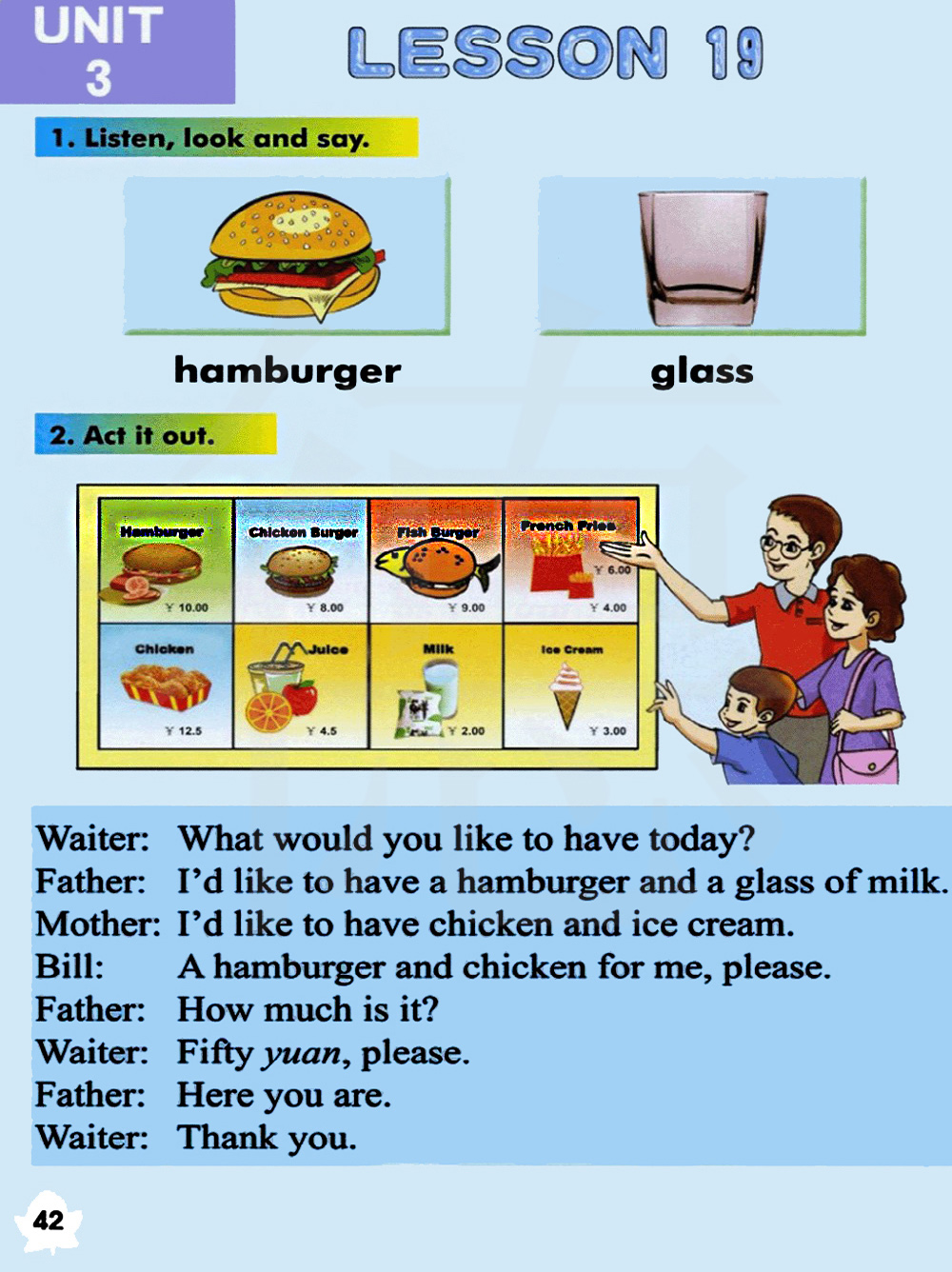 你们今天想要点什么?我想要一个汉堡包和一杯牛奶。