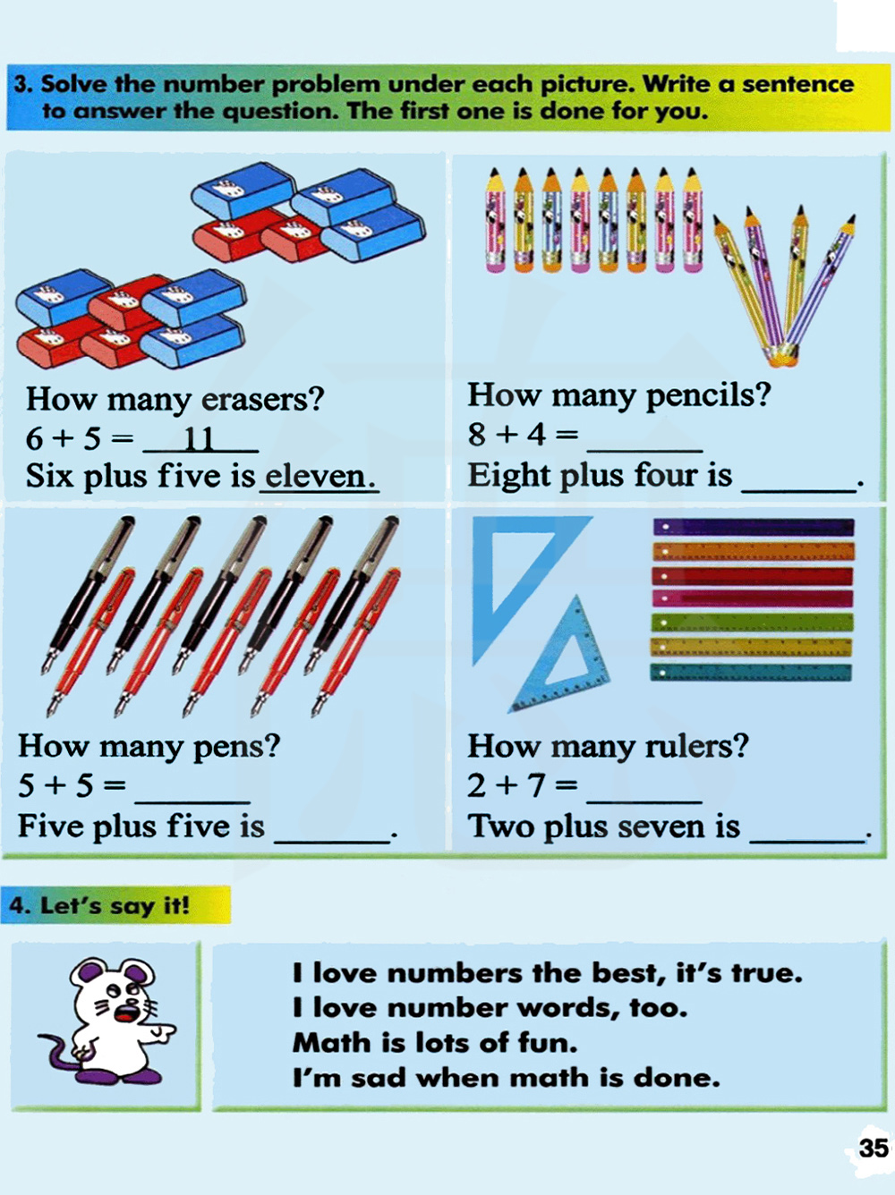 解答每幅图片中的数学问题。写一个句子来回答问题。第一题的答案已经给出。