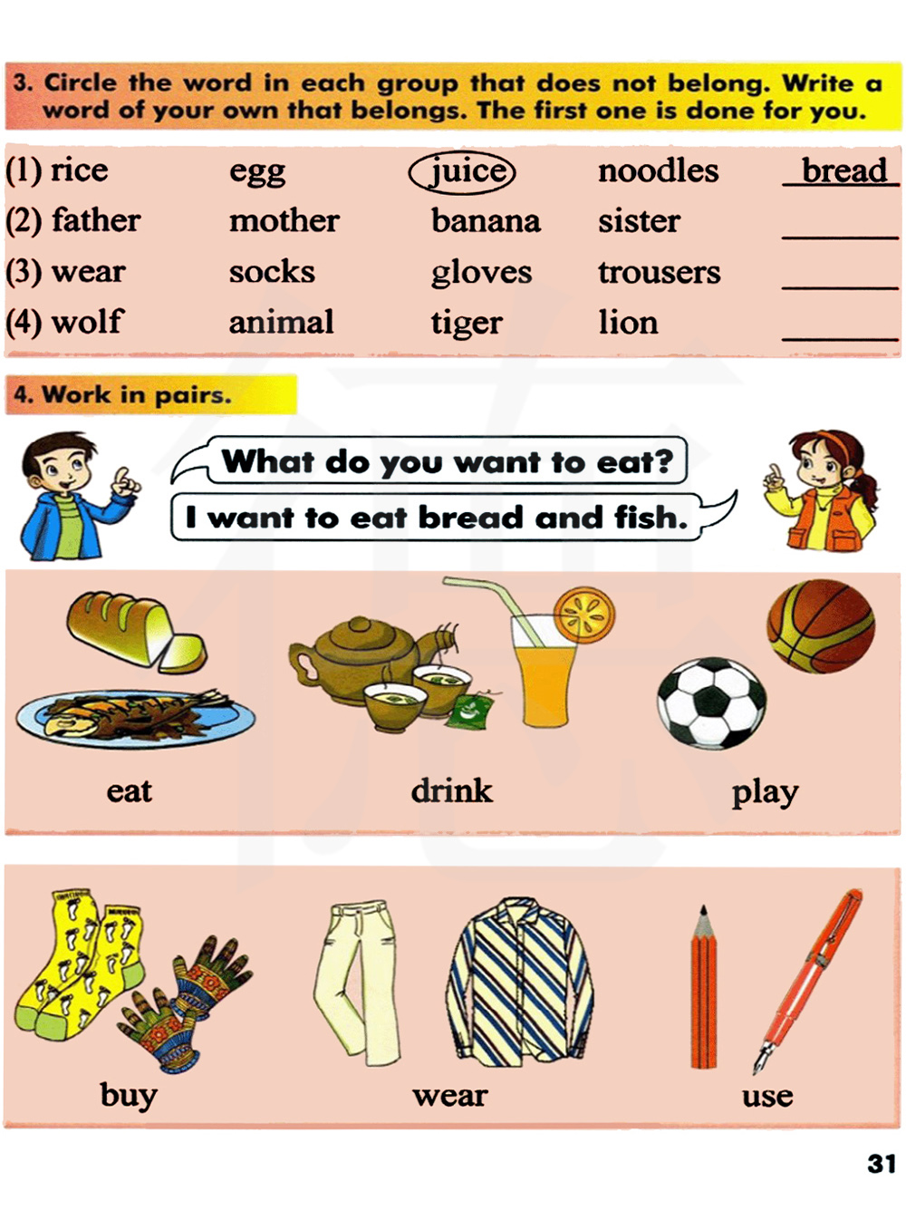 圈出美族中不属于同一类的单词。字集写一个属于哪一类的单词。第一个单词已给出。