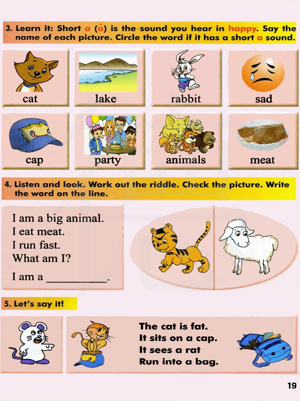 学一学:短元音a是你在单词happy听到的发音。说出每幅图片的名称。圈出含有短元音a的单词。