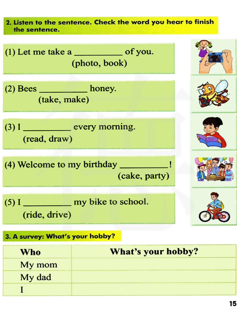 听下面的句子。选择你所听到的单词完成句子。