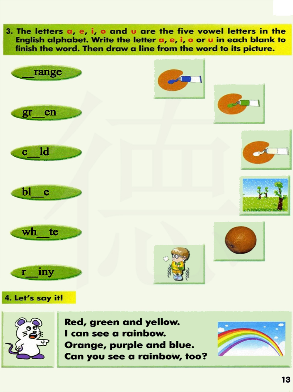 字母a,e,i,o,u是英语字母中的五个元音字母。在各单词空白处写上字母a,e,i,o,u,完成单词。然后把单词和相应图片用线连起来。