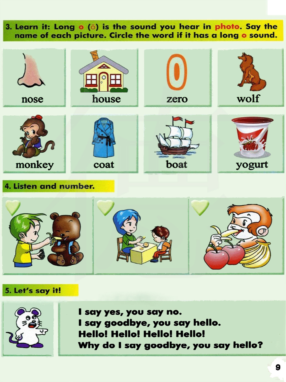 学一学:长元音o是你在单词photo听到的发音。说出每幅图片的名称。圈出含有长元音o的单词。