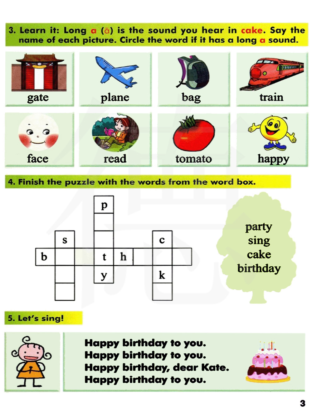 学一学:长元音a是你在单词cake 听到的发音。说出每幅图片的名称。圈出含有长元音a的单词。