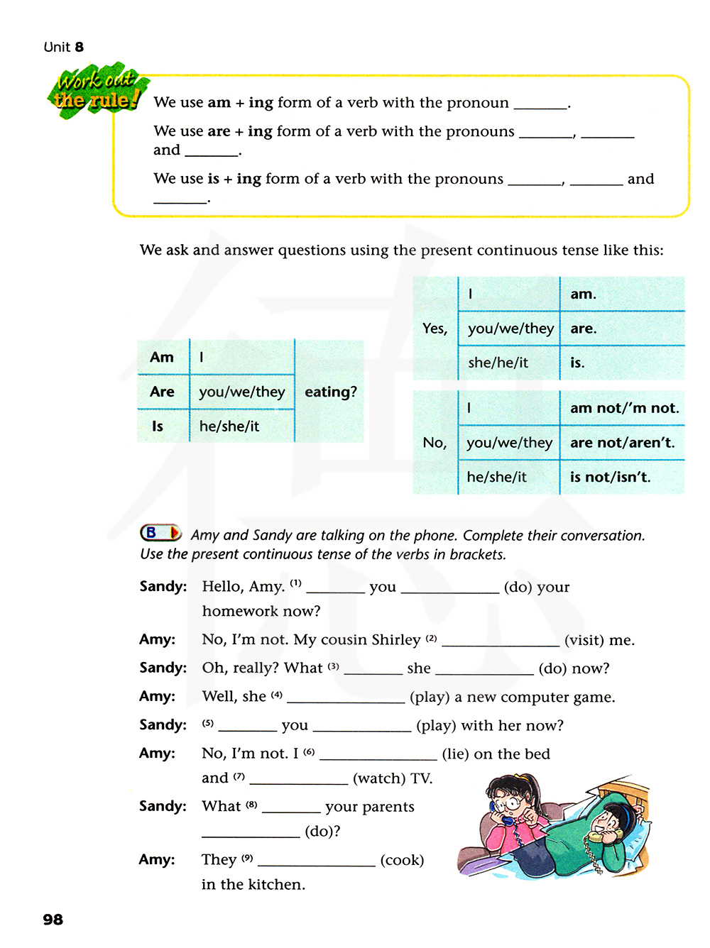 埃米和桑迪正在通电话。完成她们的对话。使用括号中动词的现在进行时。