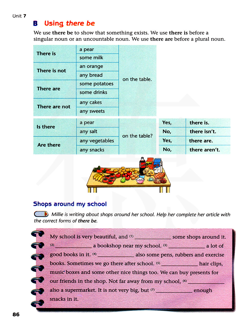 我们使用"there be"来表示某物存在。在一个单数名词或不可数名词前我们用“there is”。在复数名词前我们用“there are”。