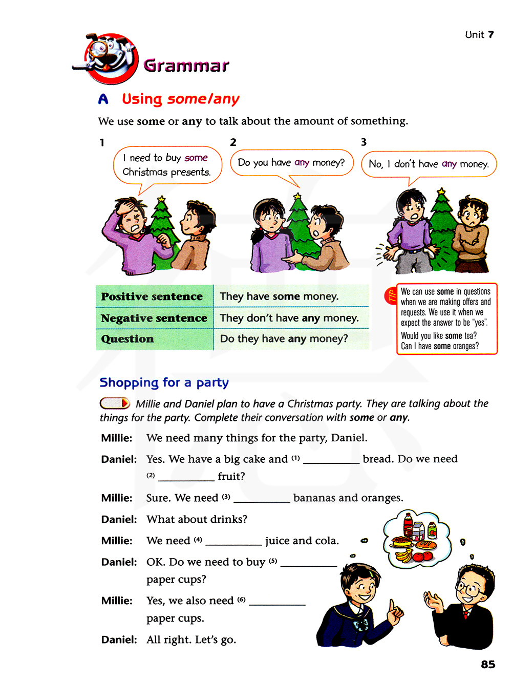 米莉和丹尼尔计划开一个圣诞聚会。他们正在谈论聚会需要买的东西。用“some”或“any”完成他们的对话。