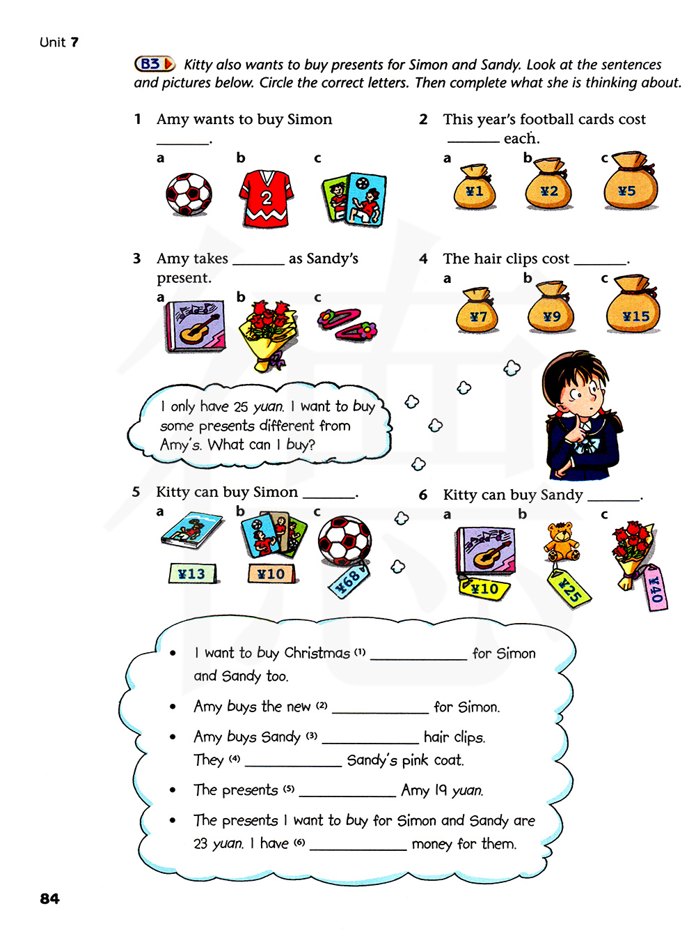 基蒂也想给西蒙和桑迪买礼物。看下面的句子和图片。圈出正确的字母。然后把她的想法补充完整。